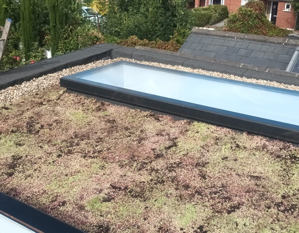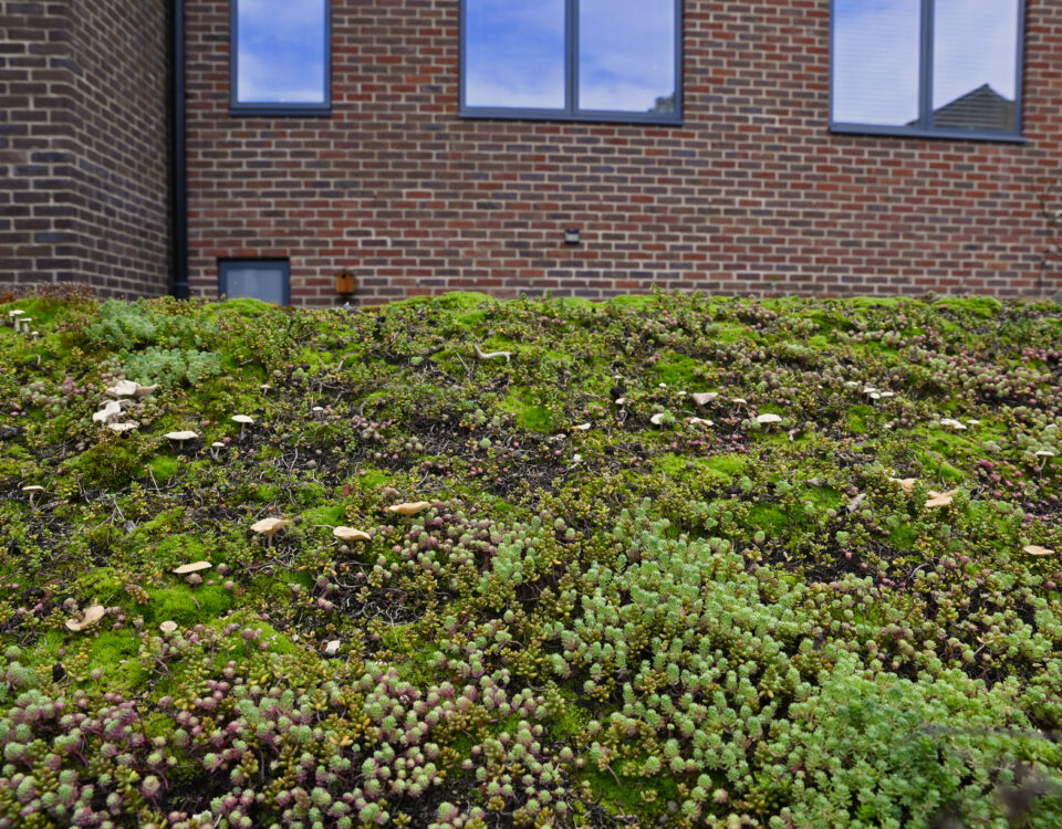 Green roof in urban environment. London, UK. Turf on the top of the garden shed. A green roof resembling a lawn or a flower meadow on garden shed sloping roof. Eco roof.